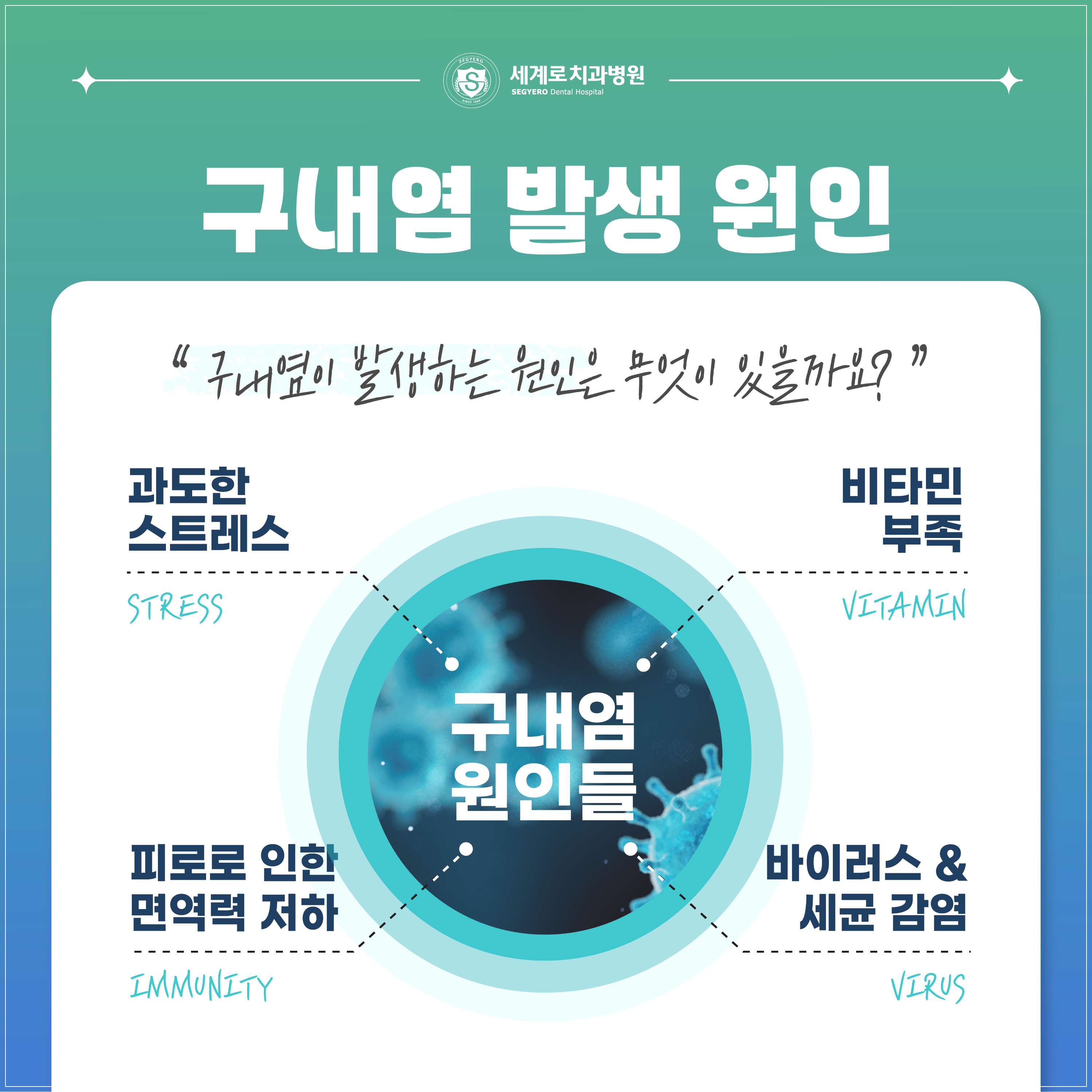 구강점막은 신체의 내부와 외부를 연결하는 중요한 위치에 있어 다양한 요인의 영향을 받습니다. 바이러스, 세균, 곰팡이 감염을 비롯해 피로, 스트레스, 호르몬 변화, 비타민 결핍, 면역력 저하 등이 주요 원인으로 작용할 수 있습니다.
