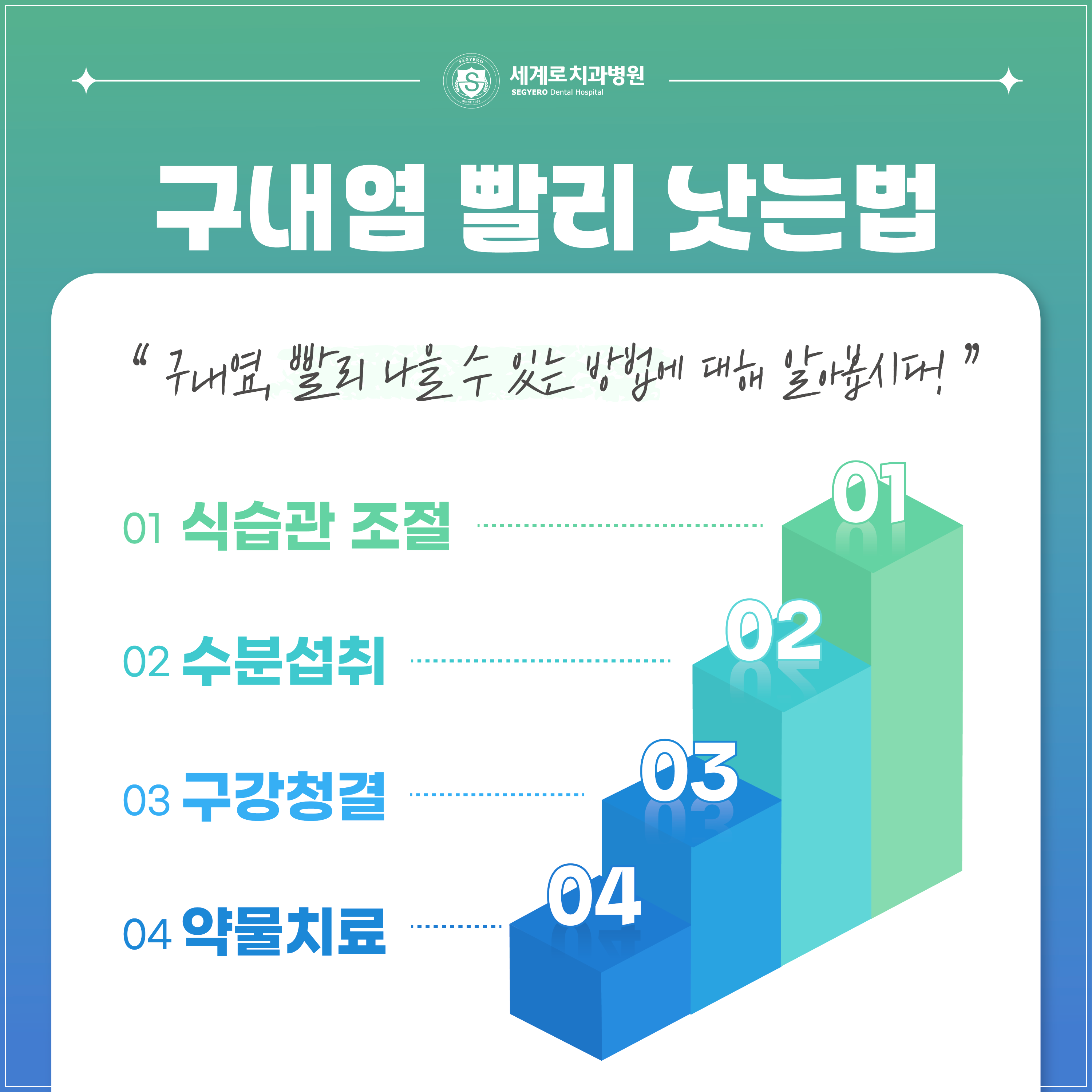 구내염을 비롯해 스케일링, 충치 치료, 임플란트, 심미 치료 등 치아 건강에 대한 고민이 있다면 언제든지 편하게 방문해 주세요.