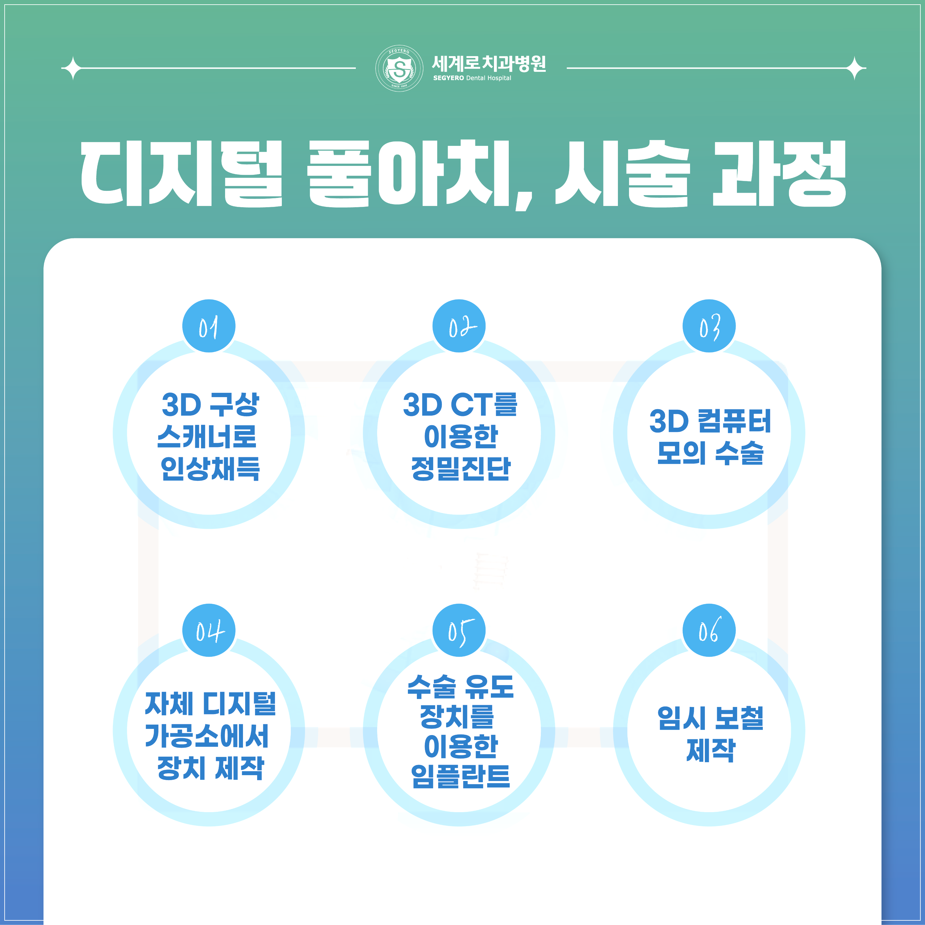 또한, 뼈나 잇몸 상태가 좋지 않아 일반 임플란트 시술이 어려운 분들에게도 디지털 풀아치가 좋은 대안이 될 수 있습니다.