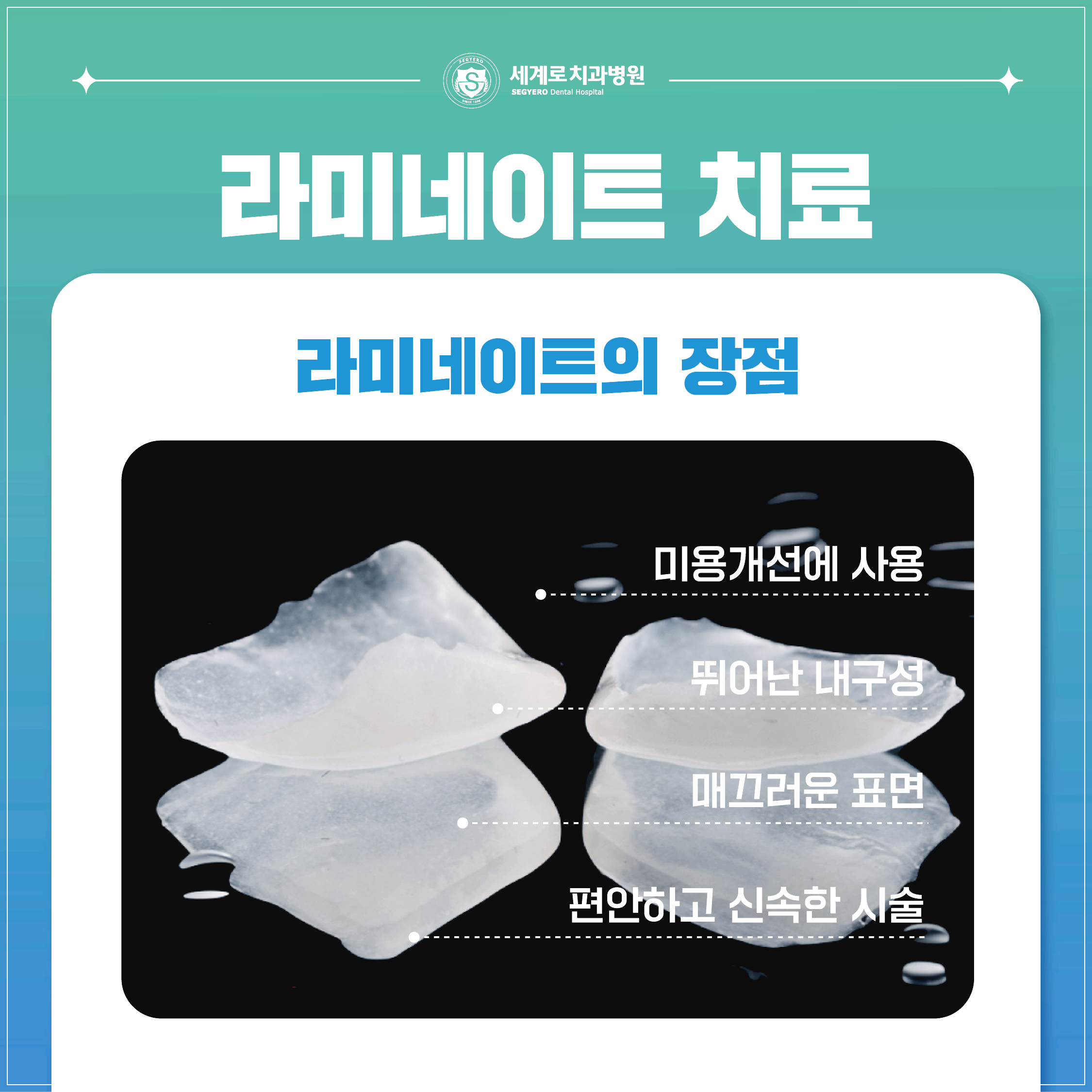 - 장점: 얇은 세라믹 판을 앞니 표면에 부착해 자연스러운 외관을 제공합니다.