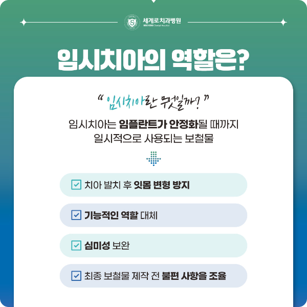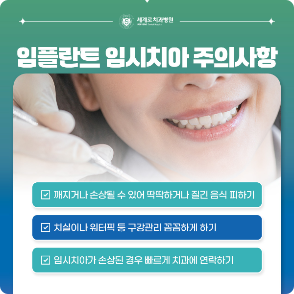 • 문제 발생 시 빠른 대처: 임시치아가 깨지거나 나사가 느슨해지면 즉시 치과에 내원하세요.